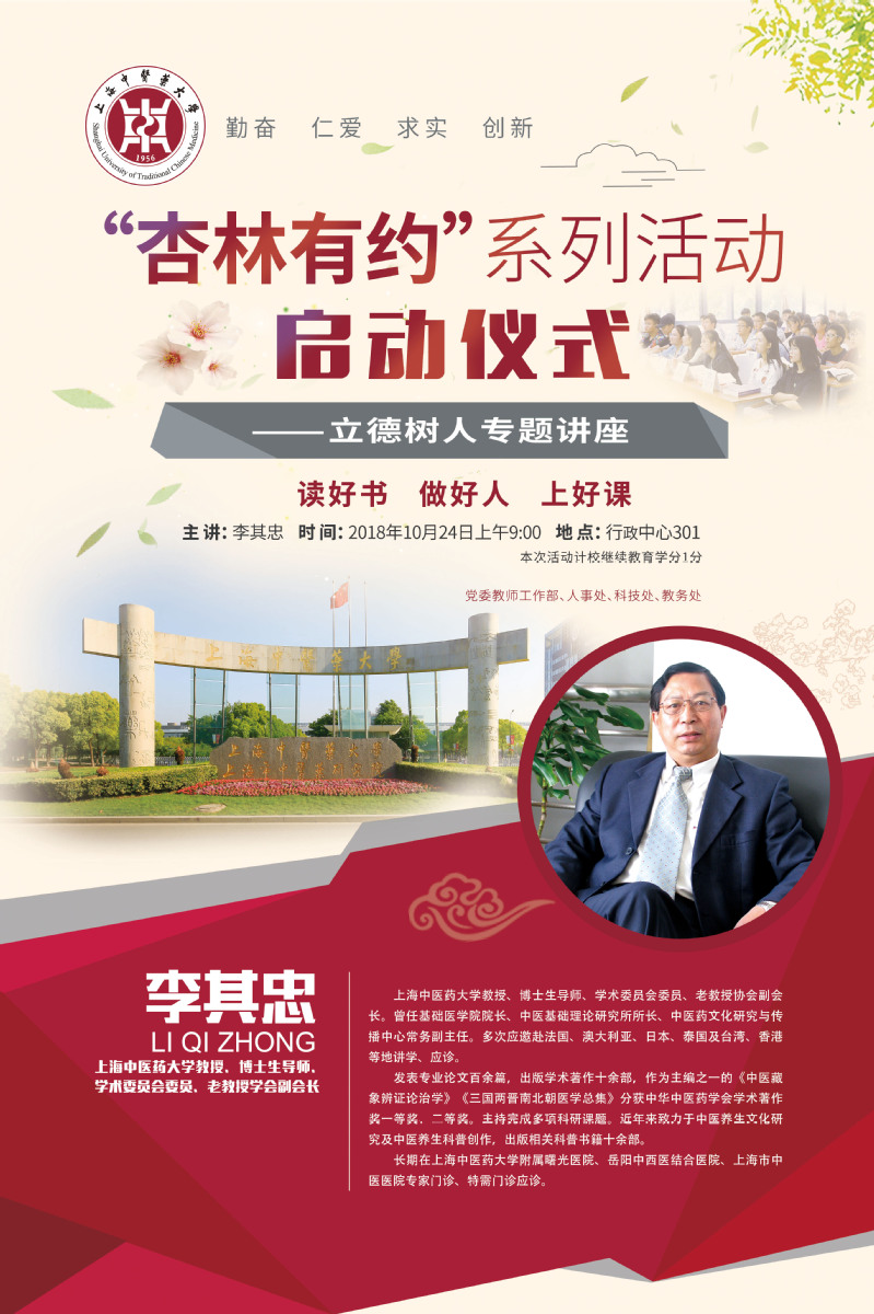 讲座通知:“杏林有约”系列启动仪式——立德树人专题讲座“读好书,做好人,上好课”