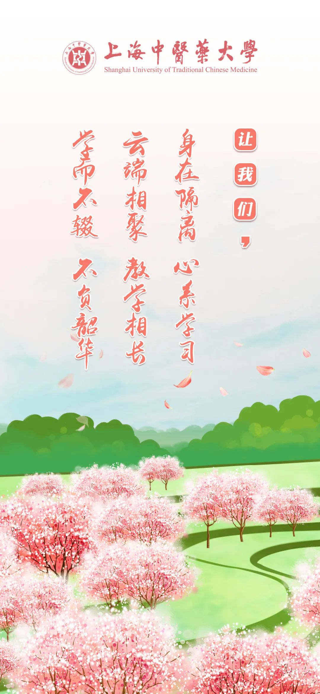 当我们迎来抗疫和学习的双重任务时,让我们以更加饱满的状态和上中医人特有的“精气神”直面险阻,迎接挑战,共同创造一个独特难忘却收获满满的春天!