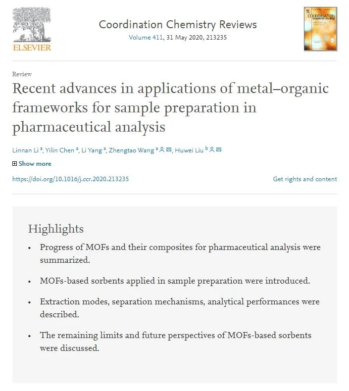 近日,sunbet申搏官网中药研究所王峥涛团队的综述论文《金属-有机框架材料在药物分析样品前处理中的研究进展(Recent advances in applications of metal–organic frameworks for sample preparation in pharmaceutical analysis, DOI: 10.1016/j.ccr.2020.213235)》在爱思唯尔(Elsevier)出版的国际知名化学期刊《配位化学评论》(Coordination Chemistry Reviews,影响因子13.476)发表。该文系统总结、评述了近年来金属-有机框架材料(Metal–organic frameworks,MOFs)及其复合材料在药物分析样品前处理中的最新进展、代表性应用及其展望,为复杂样品(包括中药、天然药物)中微量、痕量活性成分的分离、分析提供了重要科学参考资料。