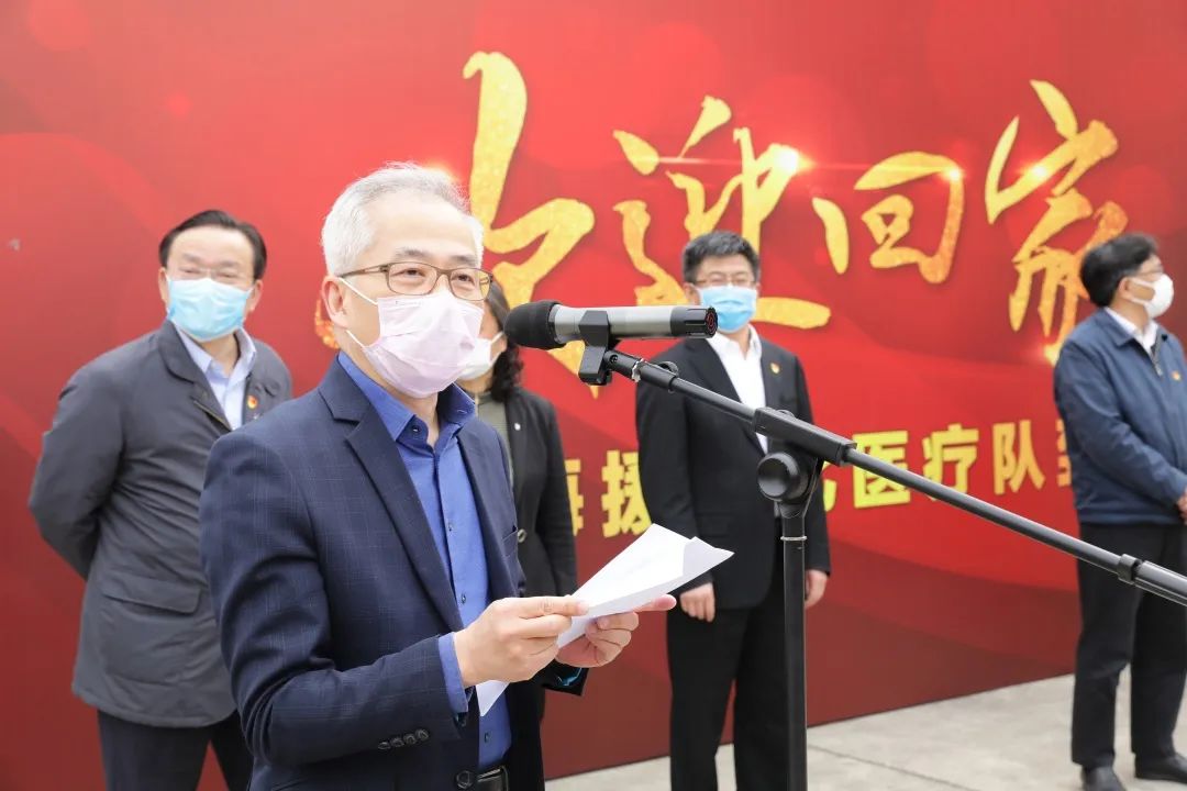 在简短而隆重的欢迎仪式上,校长徐建光代表学校领导班子和全校师生,向医疗队员们表示最衷心的感谢和最崇高的敬意,并向他们的家人们表示最诚挚的问候。他感谢医疗队员们在关键时刻,挺身而出、披甲上阵,逆行而上,用高尚无私的医德医风,精湛高超的医技医术,守护生命,治愈病患,圆满完成了援助湖北武汉的医疗救治任务。