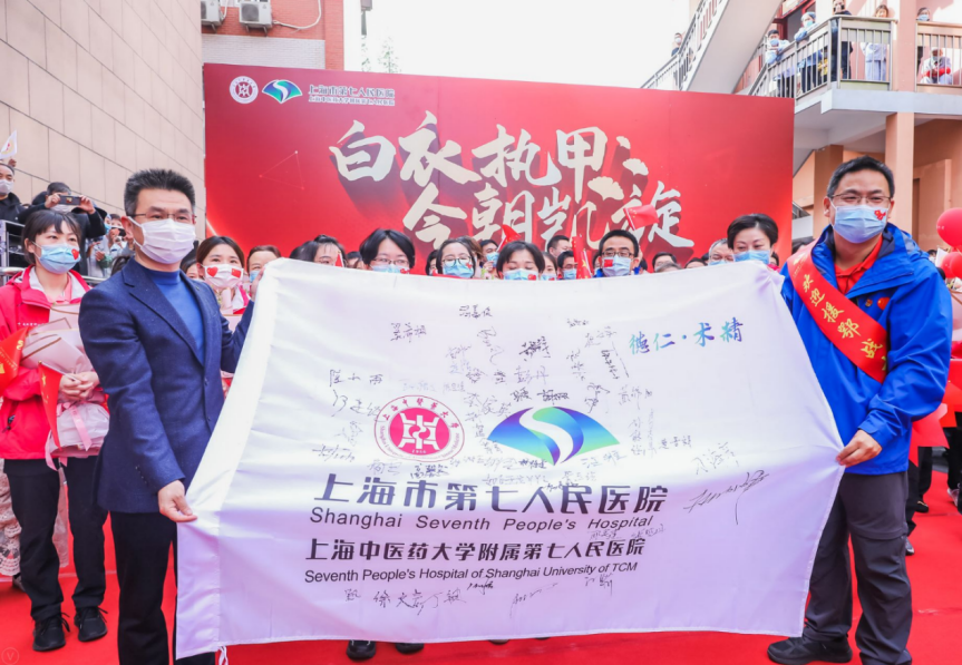 仪式上,医院向高桥镇和浦东新区红十字会分别赠送了由医院全部54名援鄂队员亲笔签名的队旗和红十字会旗。