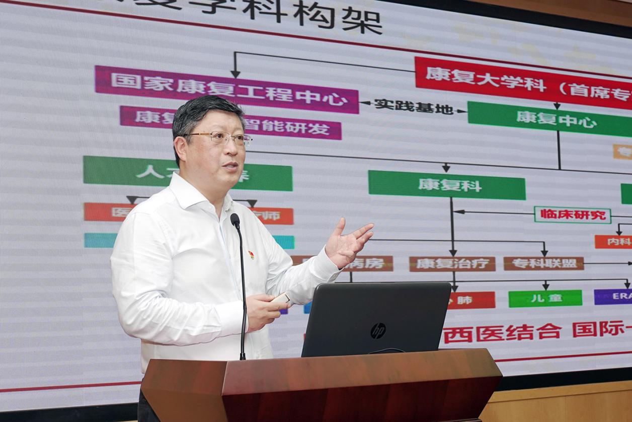 医院院长周嘉介绍了医院康复学科的历史和发展,规划了岳阳大康复学科的发展定位、建设目标。作为上海市康复医学会副会长单位、上海市指定工伤医疗康复机构、全国首个康复治疗师专业委员会挂靠单位,医院康复场地面积超2500平方米,设有康复门诊、治疗大厅、步态分析实验室、康复病房等,拥有国际领先的小卡伦、经颅磁刺激、上、下肢康复机器人等中西医诊疗评估设备,总值达6500万元。在上海最早建立了四级康复医疗服务网络,形成了神经、骨关节、心肺、儿童、术后加速康复五大优势亚专科。2018年,医院六大临床诊疗中心之一的康复中心成立,秉承“中西医结合康复”理念,积极整合优质资源,在教学、科研、医疗、中医传承、国际交流合作等领域成效显著。周嘉表示,希望今后在大学的领导下,在首席专家的带领下,把岳阳大康复学科打造成中西医结合国际一流、国内领先的大康复学科。