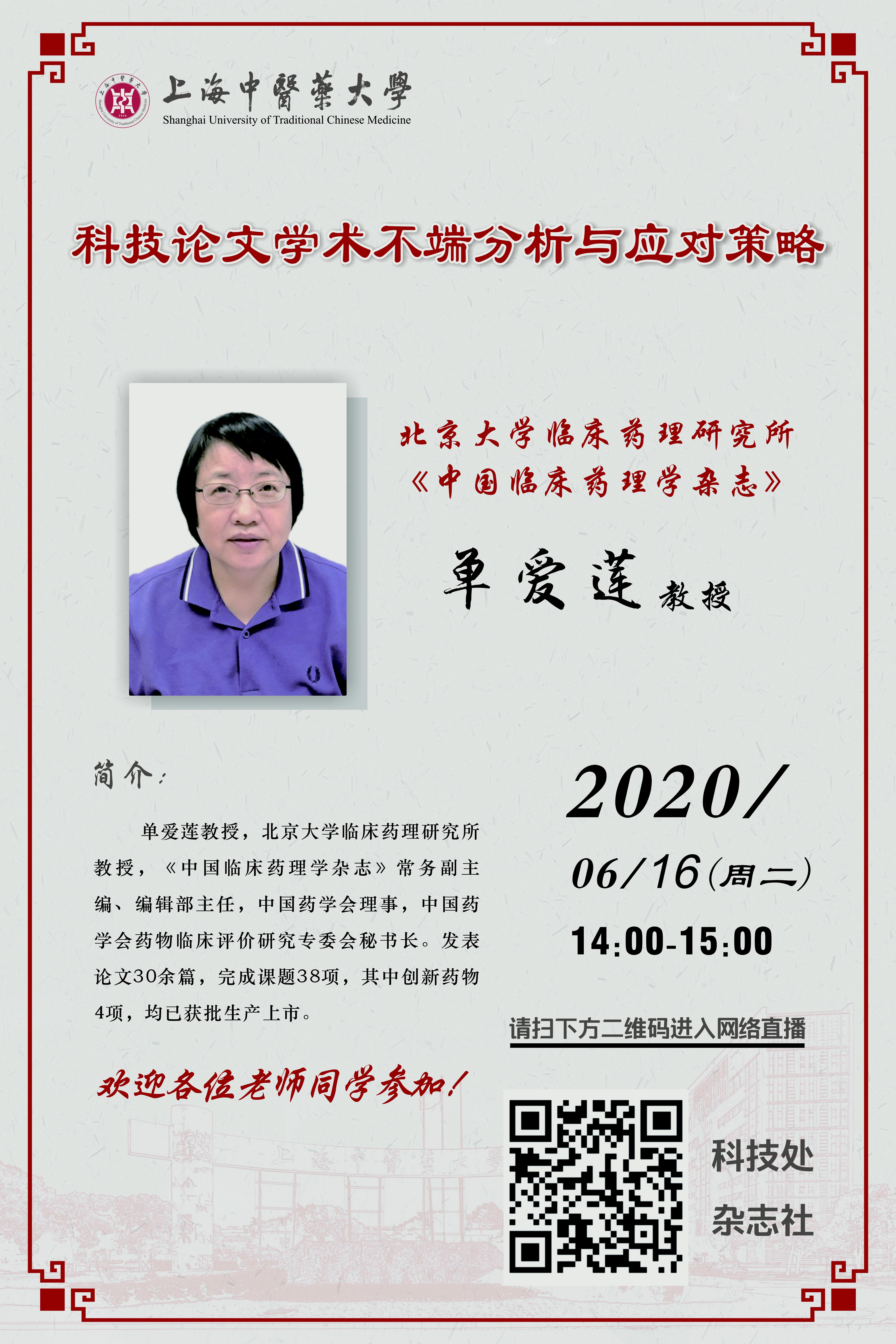 6月16日,sunbet申搏官网科技处和杂志社共同组织开展主题为“科技论文学术不端分析与应对策略”的学术讲座。北京大学临床药理研究所《中国临床药理学杂志》常务副主编、编辑部主任单爱莲教授受邀作讲座报告。讲座采用在线直播的方式,700余人参与在线学习并与专家交流互动。