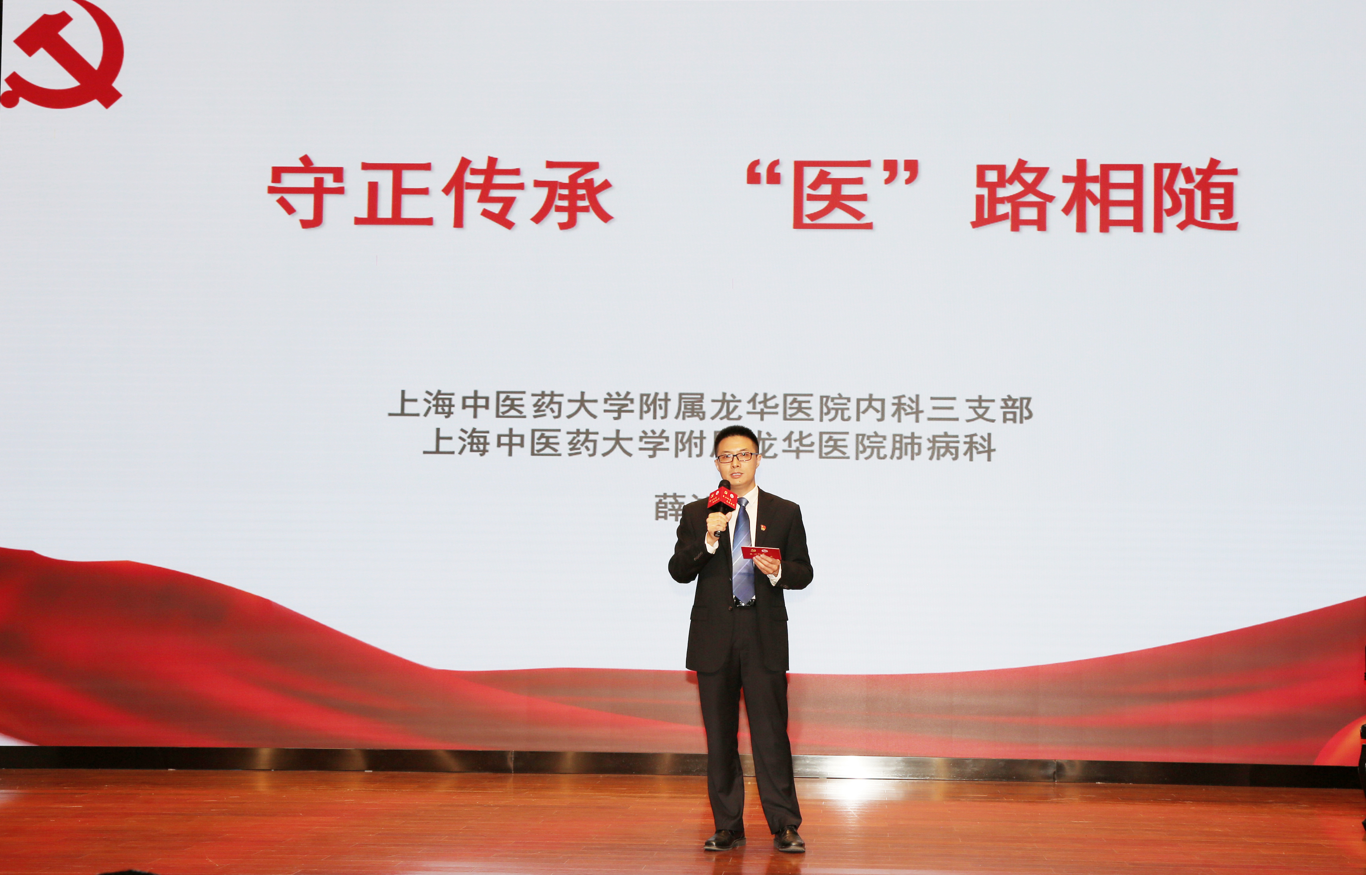龙华医院肺病科副主任薛鸿浩两次应召进入上海市公共卫生临床中心一线抗疫,他向大家介绍了“武汉一家人”的故事,用实际案例展示了中医药的魅力,他传承了邵长荣教授、吴银根教授、张惠勇教授的临床经验,尤其邵长荣教授“祖国医学放光芒,岂让瘟神再猖狂”这句话更是时时激励着他,给他以信心。