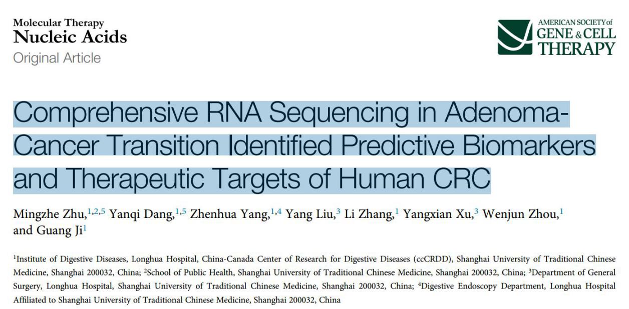 近日,sunbet申搏官网脾胃病研究所季光团队,与附属龙华医院胃肠外科许阳贤团队的合作研究,在结直肠癌炎癌转化机制和早期生物标志物发现上取得重要进展,研究发现为结直肠癌的早期诊断及治疗提供实验依据。研究成果分别在国际学术期刊Molecular Therapy-Nucleic Acids及Clinical and Translational Medicine上发表。