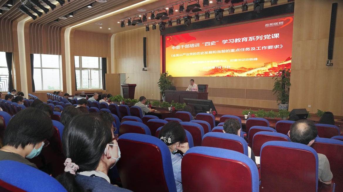 7月14日,附属岳阳中西医结合医院党委结合医院中层干部培训,组织开展“四史”学习教育系列党课,校党委副书记、纪委书记许铁峰应邀作《全面从严治党的历史发展和当前的重点任务及工作要求》专题讲座,会议由医院党委副书记、纪委书记赵庆主持。
