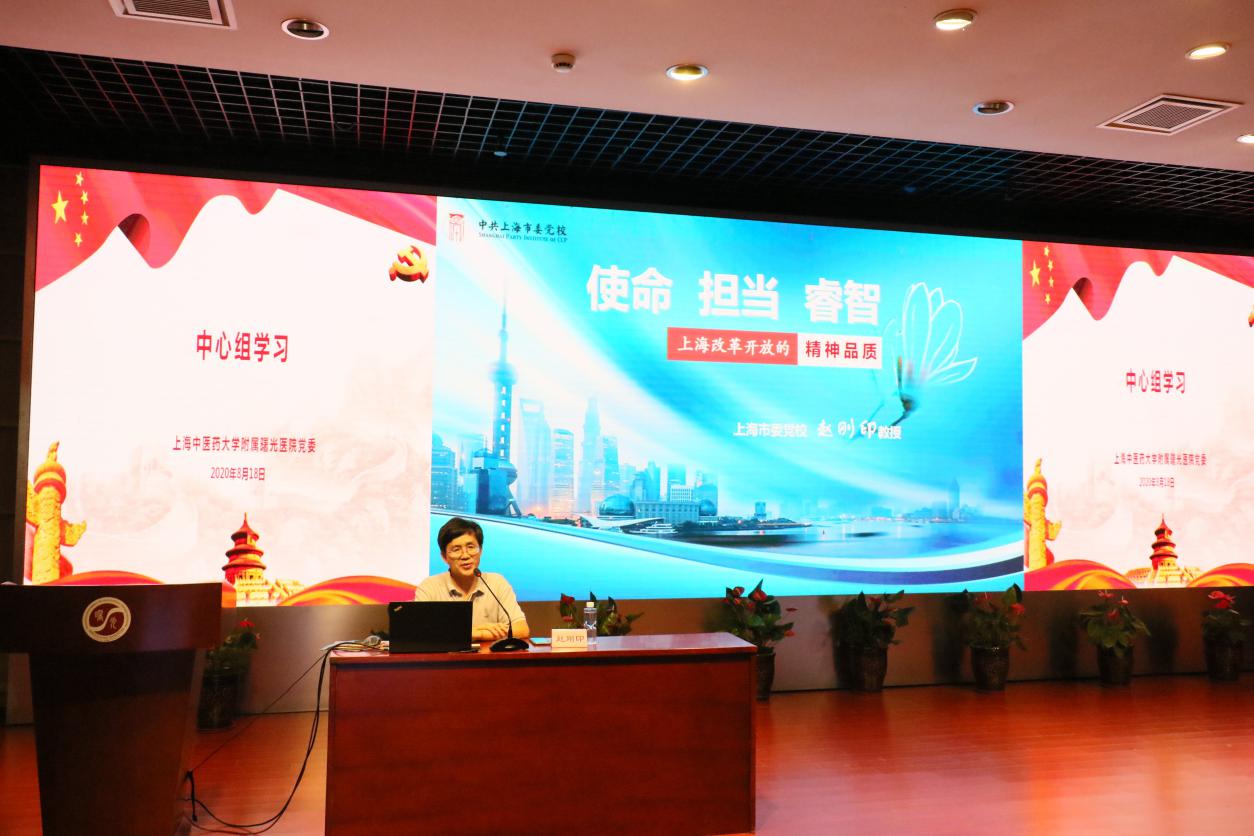 为深入推进“四史”学习教育,践行初心使命,8月18日下午,曙光医院举办“四史”学习教育专题学习会暨党委中心组学习,邀请中共上海市委党校党史党建教研部副主任、政党研究所副所长赵刚印作“上海改革开放的精神品质”专题讲座,曙光医院党政领导班子、党委委员、纪委委员、党支部书记、职能部门负责人、科室负责人等参加会议。会议由曙光医院党委副书记、院长周华主持。