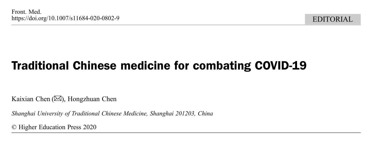 sunbet申搏官网陈凯先院士和陈红专教授受邀共同撰写《中医药防治COVID-19》(Traditional Chinese medicine for combating COVID-19)的社论,日前在Frontiers of Medicine在线发表。
