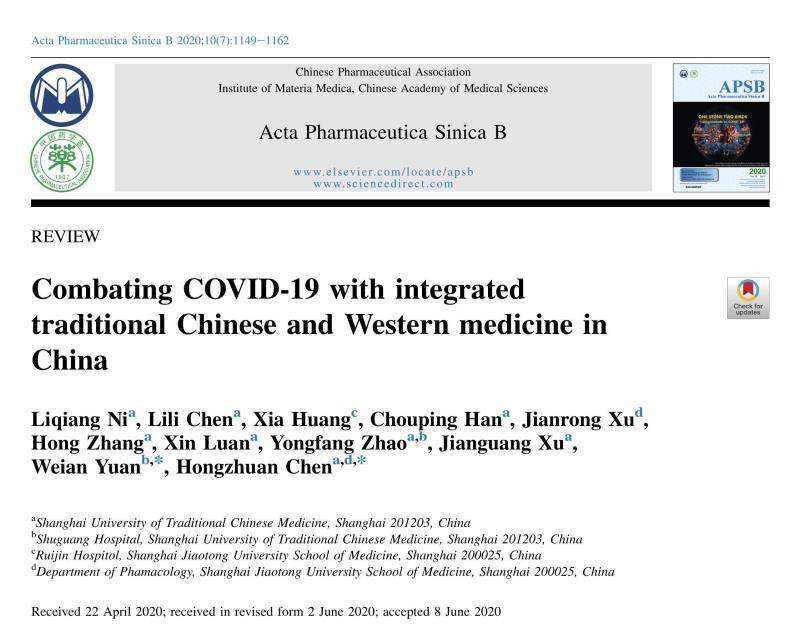 陈红专教授团队撰写的综述《我国中西医协同防治新冠肺炎》(Combating COVID-19 with integrated traditional Chinese and Western medicine in China)作为Acta Pharmaceutica Sinica B(APSB)“抗疫专刊”【Research on Emerging COVID-19 (Target, Mechanism, and Therapeutics)】的开篇论文发表。
