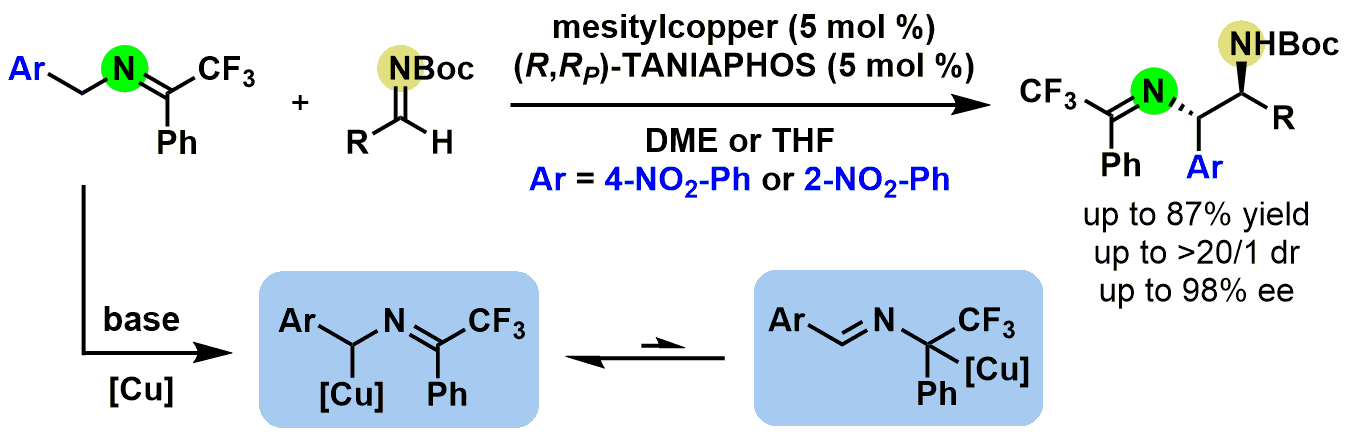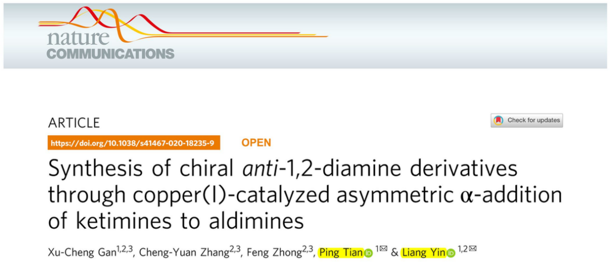近日,sunbet申搏官网创新中药研究院林国强院士团队在《自然通讯》(Nature Communications)上发表研究论文Synthesis of chiral anti-1,2-diamine derivatives through copper(I)- catalyzed asymmetric α-addition of ketimines to aldimines,采用铜催化的亚胺的不对称分子间交叉偶联反应,高效且立体专一性地构建了天然产物中常见的手性二胺骨架。
