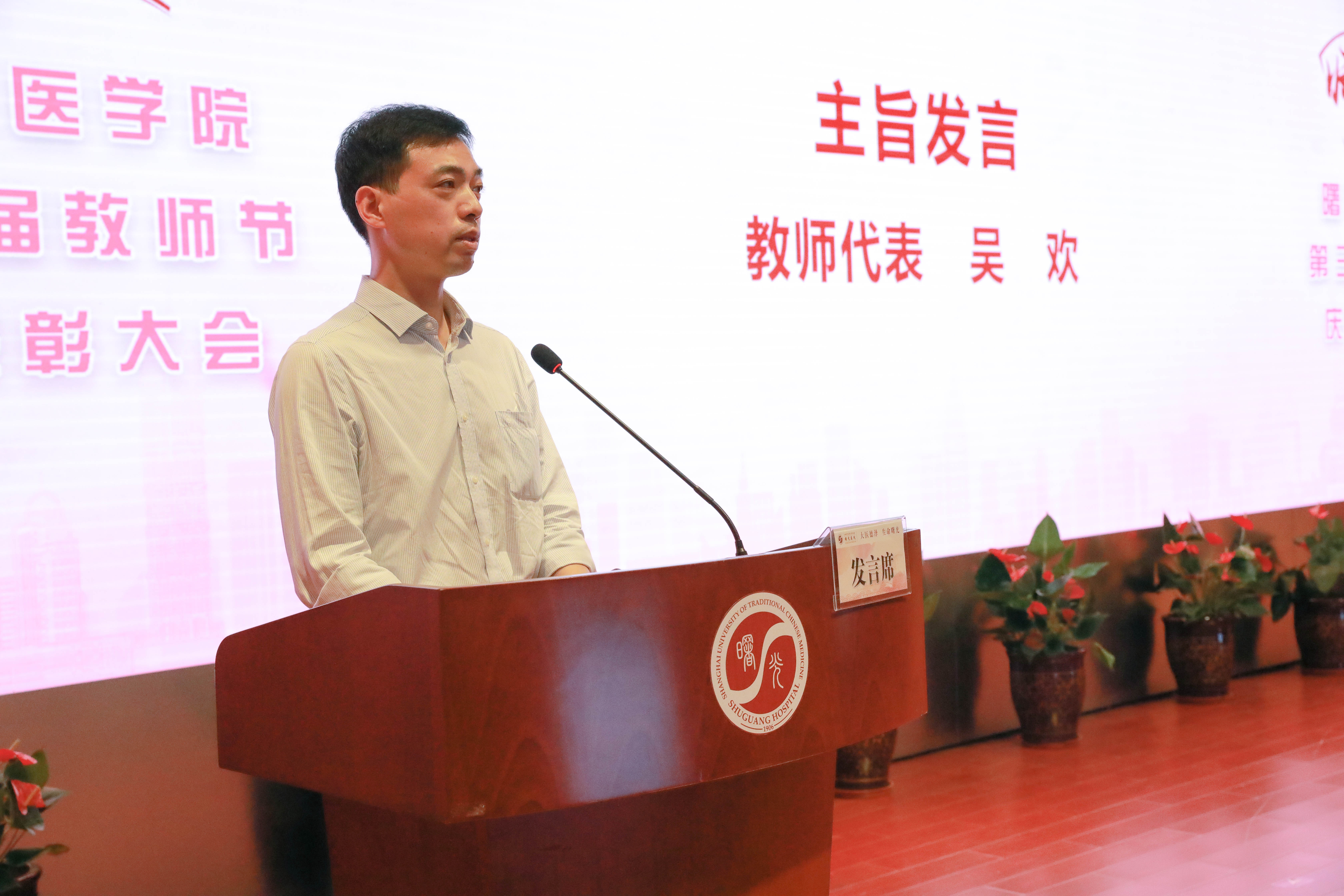 中医内科学教研室吴欢作为教师代表作主旨发言,吴老师结合在上海市疾控中心的抗疫经历,向我们展示了中医药在本次抗疫过程中发挥的巨大作用,号召全体青年教师练内功、修德行、承医志,继承发扬前辈优秀的教学传统,为曙光教学工作添砖加瓦。