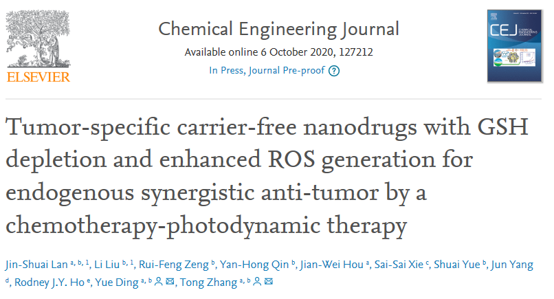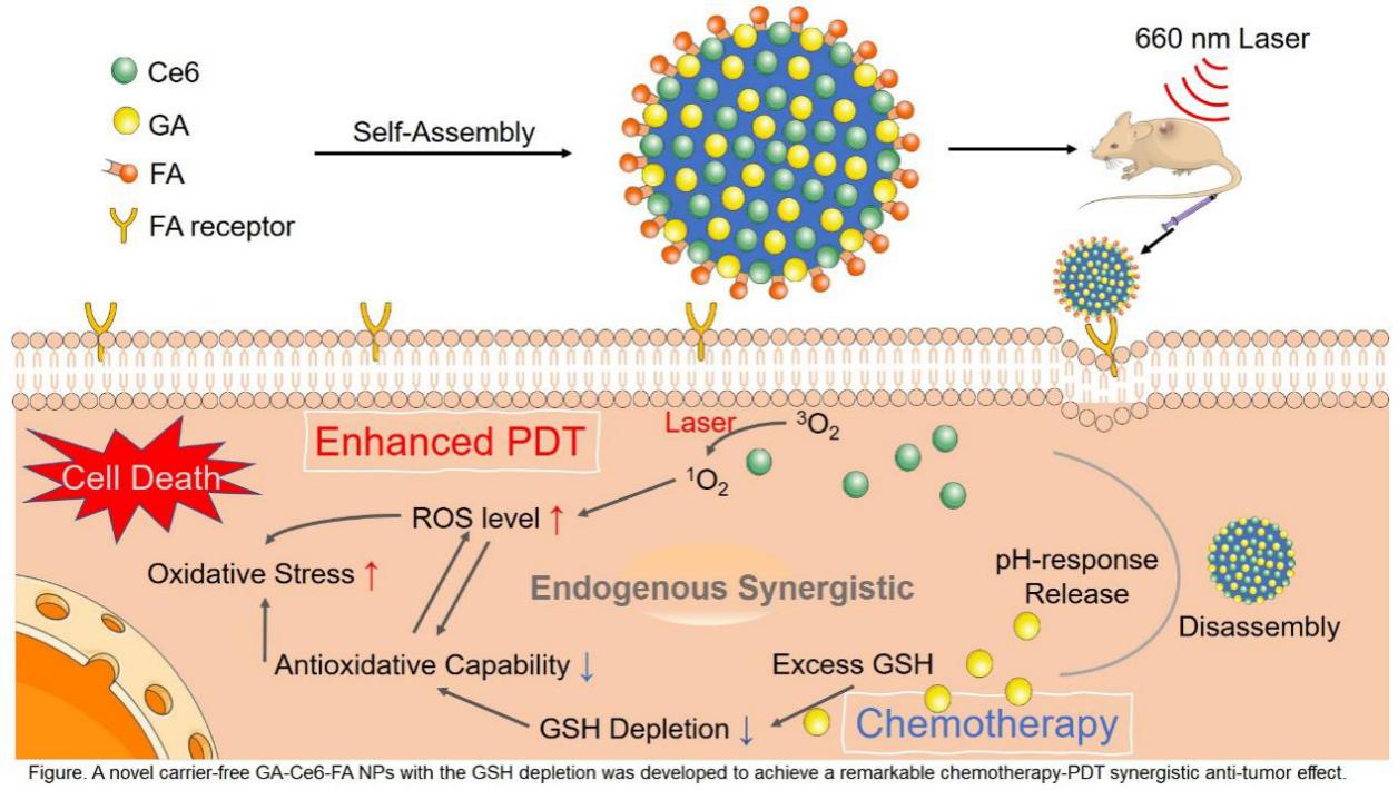 近日,sunbet申搏官网中药学科张彤教授课题组在抗肿瘤中药活性成分藤黄酸(gambogic acid,GA)新型无辅料纳米给药系统研究中取得重要突破,成功构建了一种新型无载体纳米制剂(GA-Ce6-FA),为未来提高中药调节肿瘤微环境能力,开展中西协同光动力临床治疗方案提供了可能。该项研究成果Tumor-specific carrier-free nanodrugs with GSH depletion and enhanced ROS generation for endogenous synergistic anti-tumor by a chemotherapy-photodynamic therapy发表在国际顶级学术期刊Chemical Engineering Journal(6 Oct 2020,DOI: https://doi.org/10.1016/j.cej.2020.127212)。