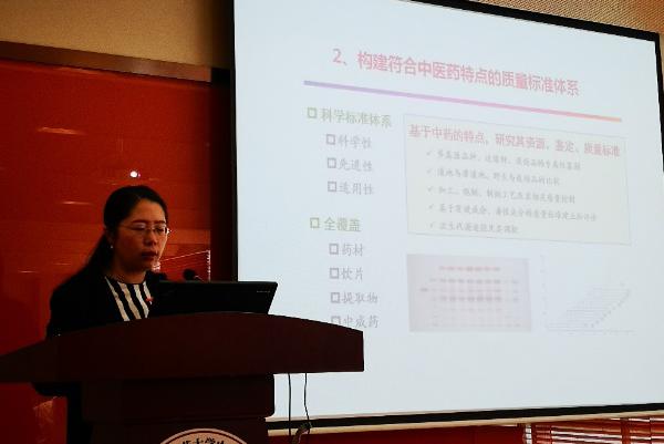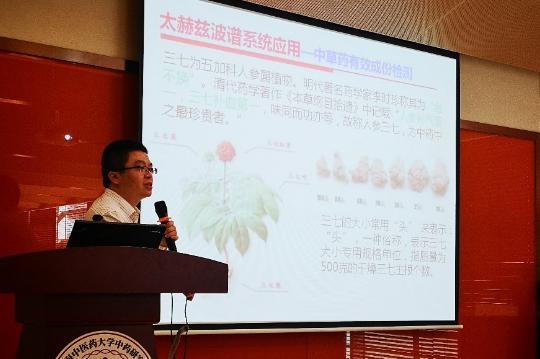 随后,杨莉作关于“珍稀贵重中药材鉴定与品种评价研究”的学术报告,从当前我国中药质量评价体系面临的诸多瓶颈问题出发,介绍了构建符合中医药特点的现代质量标准体系对临床用药安全和中药材产业发展的重要意义,并以人参、沉香和石斛等珍稀贵重药材为例,讲述了其团队在药材及制剂标准提升、分析方法开发和应用、药效物质基础阐明和评价等方面作出的贡献。并介绍了研究团队正在开展的基于新型绿色分离策略、原位电离质谱等前沿技术在相关药材研究中的初步应用。会上,朱亦鸣、杨莉还就太赫兹波谱系统等在中药材质量控制和品质评价中的应用前景进行深入探讨。