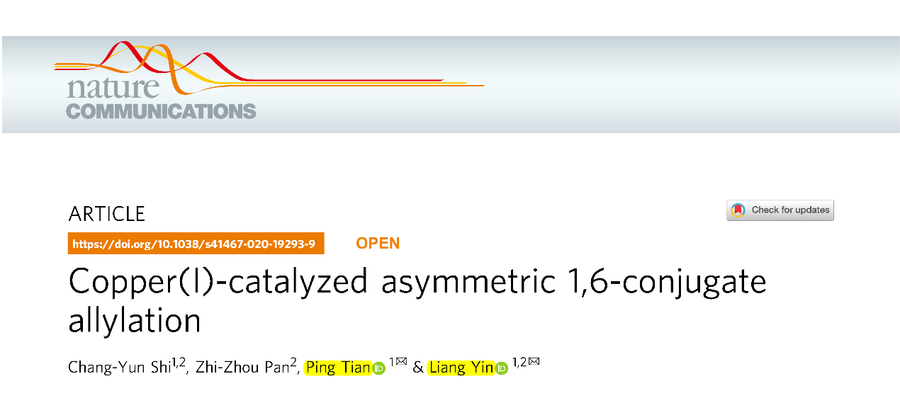 近日,sunbet申搏官网创新中药研究院林国强院士团队田平课题组和中国科学院上海有机化学研究所殷亮课题组联合研究团队在《自然通讯》(Nature Communications)上发表研究论文Copper(I)-catalyzed asymmetric 1,6-conjugate allylation,采用金属铜和手性卡宾配体成功实现了催化的不对称1,6-烯丙基共轭加成反应。