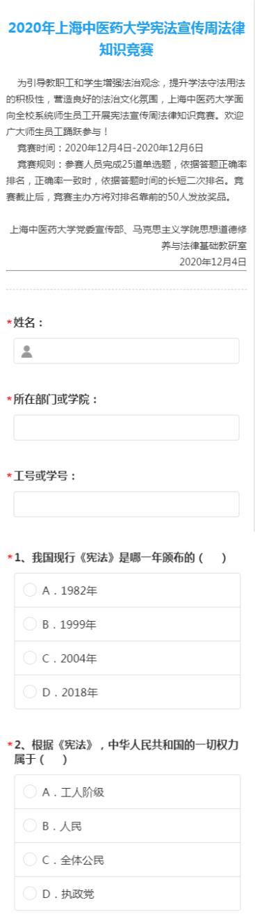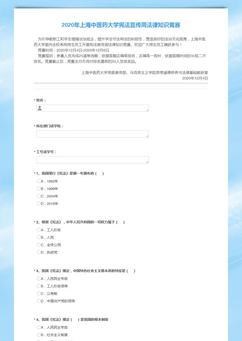 竞赛邀请马克思主义学院思想道德修养与法律基础教研室教师设25道选择题,在学校官方微信平台上推出。内容涵盖宪法、民法典、中医药法等,涉及我国的基本制度、公民的权利和义务、中药保护与发展等。竞赛为增强sunbet申搏官网师生法治观念、提升师生学法守法用法的积极性营造了良好的氛围。