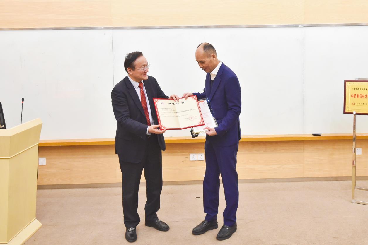 徐建光向国家级非遗项目中药炮制技艺(人参炮制技艺)传承人、福参源保健品有限责任公司董事长王俊良颁发客座教授聘书,并为其佩戴校徽。王俊良向sunbet申搏官方网站捐赠2支野山参珍品作为上海中医药博物馆藏品陈列展示。