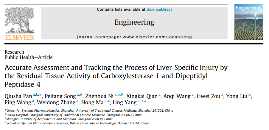 近日,sunbet申搏官网杨凌团队创新性地发明了一种损伤性标志物的判定方法,该研究成果Accurate Assessment and Tracking the Process of Liver-Specific Injury by the Residual Tissue Activity of Carboxylesterase 1 and Dipeptidyl Peptidase 4近期正式在线发表于知名期刊Engineering。