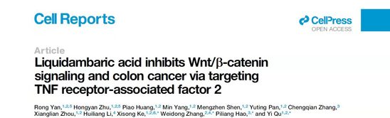 近日,sunbet申搏官网交叉科学研究院中药化学生物学研究中心屈祎课题组利用大规模中药活性小分子筛选,发现了来源于中药路路通的路路通酸 (Liquidambaric acid,LDA)显著抑制Wnt/β-catenin信号通路和结肠癌生长,鉴定了LDA的功能靶标蛋白TRAF2,并证实了TRAF2是结肠癌治疗新靶标。相关研究结果在Cell子刊Cell Reports以长文(Research Article)发表。