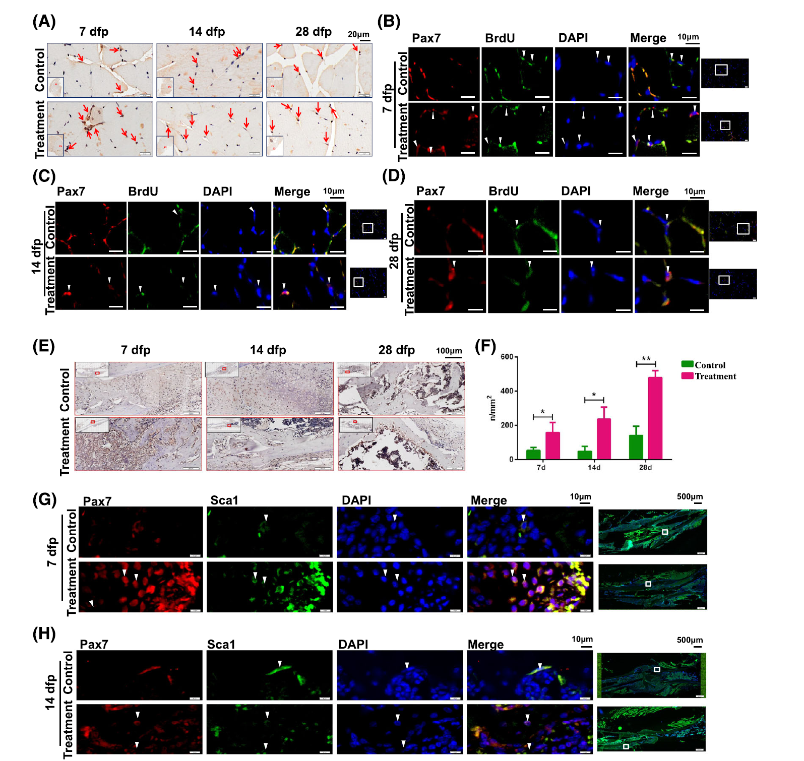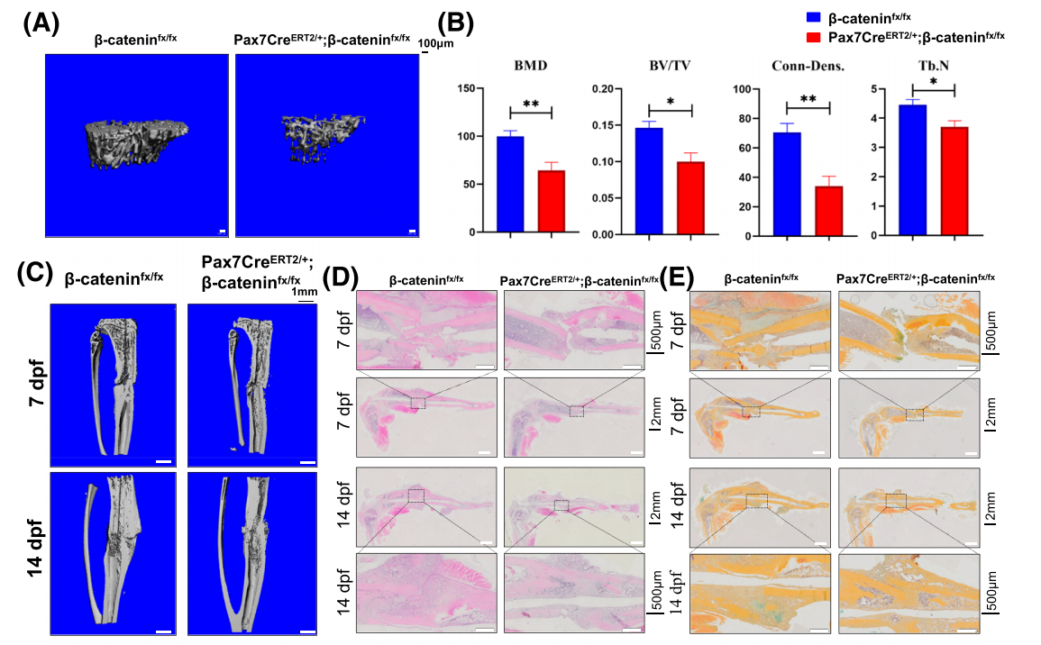 该研究首先利用了临床生物样本,发现骨质疏松性骨折患者骨骼肌卫星细胞数目明显减少,β-catenin表达明显降低;并进一步建立了Pax7-CreERT2/+; β-cateninfx/fx条件性基因敲除动物模型,特异性敲除骨骼肌卫星细胞中的β-catenin,发现骨骼肌卫星细胞不仅成肌分化下降,而且成骨分化能力也降低,并且出现严重的骨量减少和骨微结构破坏,导致骨质疏松性骨折愈合的延迟。