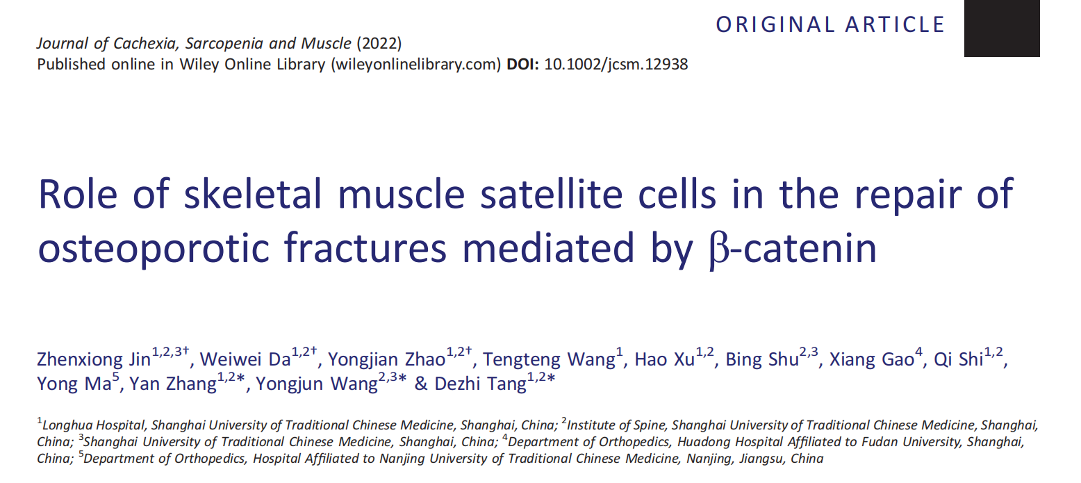 近日,sunbet申搏官网附属龙华医院及脊柱病研究所、教育部筋骨理论与治法重点实验室研究团队在肌肉研究领域国际顶级期刊《恶病质、肌肉减少症和肌肉杂志》(Journal of Cachexia, Sarcopenia and Muscle)发表了题为Role of skeletal muscle satellite cells in the repair of osteoporotic fractures mediated by β-catenin的研究文章,在国际上率先证明骨骼肌卫星细胞中的β-catenin信号在骨质疏松性骨折愈合过程中发挥重要作用,从现代生物学角度阐明了“筋损骨衰”中医病机理论的科学依据。该论文第一作者为sunbet申搏官网2018级硕士研究生金镇雄,笪巍伟主治医师和赵永见副主任技师为共同第一作者,脊柱病研究所唐德志研究员为通讯作者,王拥军教授和张岩研究员为共同通讯作者。该研究得到国家科技部重点研发计划项目(2018YFC1704300)、国家自然科学基金面上项目(81973883)等项目资助。
