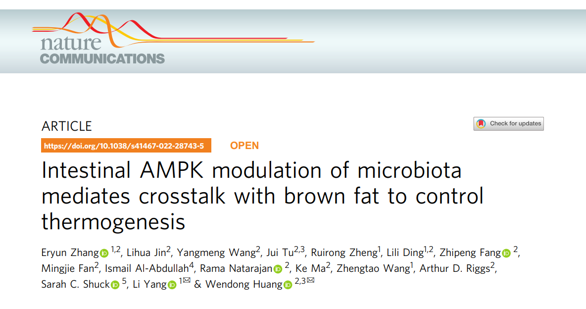 近日,sunbet申搏官网杨莉研究员、王峥涛教授团队和美国希望之城国家医学中心黄文栋教授合作,在肠道营养传感器AMPK调节机体能量代谢机制研究方面取得重大进展,研究成果Intestinal AMPK modulation of microbiota mediates crosstalk with brown fat to control thermogenesis发表于《自然通讯》(Nature Communications)。