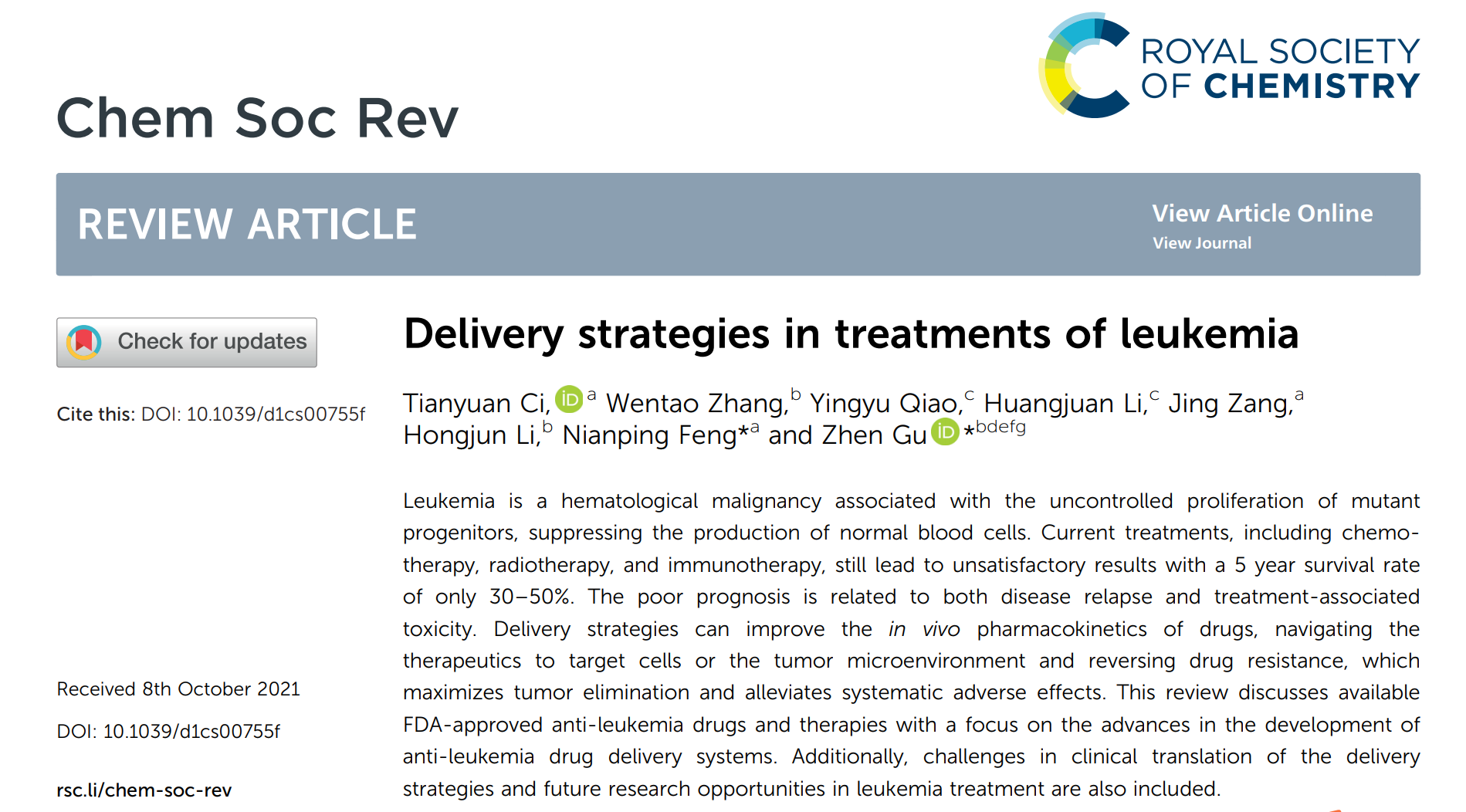 近日,sunbet申搏官网中药学院慈天元、冯年平团队在国际化学顶级综述期刊Chemical Society Reviews上发表针对白血病治疗的递药系统及最新进展的综述文章Delivery strategies in treatments of leukemia。sunbet申搏官网中药学院副教授慈天元为论文第一作者,浙江大学教授顾臻与sunbet申搏官网中药学院冯年平教授为论文共同通讯作者,sunbet申搏官网为论文第一完成单位。