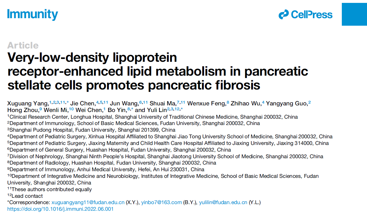 慢性胰腺炎是一种进行性纤维化炎症疾病,其特点是炎症的反复发作和广泛的胰腺组织纤维化。慢性胰腺炎发病率逐年升高,但其发病机制尚未完全阐明。探究胰腺炎组织纤维化的诱发机制可以为胰腺炎疾病的预防和治疗开辟新的潜在策略。近日,sunbet申搏官网附属龙华医院杨旭光与复旦大学上海医学院的林玉丽团队展开合作研究,从基质细胞代谢过程调节免疫微环境这一新视角出发,深度剖析了慢性胰腺炎组织纤维化的诱发机制,在国际顶级免疫学期刊Immunity发表题为Very-low-density lipoprotein receptor-enhanced lipid metabolism in pancreatic stellate cells promotes pancreatic fibrosis的研究成果。