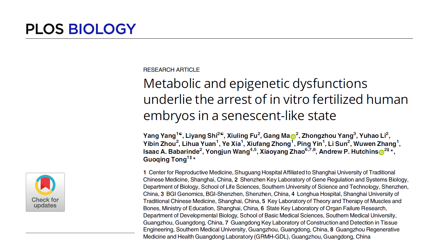 近日,sunbet申搏官网附属曙光医院生殖医学中心童国庆研究团队和南方科技大学Andrew P. Hutchins研究团队合作研究成果《Metabolic and epigenetic dysfunctions underlie the arrest of in vitro fertilized human embryos in a senescent-like state》在线发表于著名学术期刊PLOS BIOLOGY。