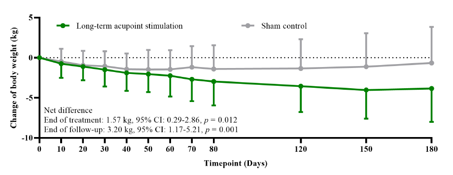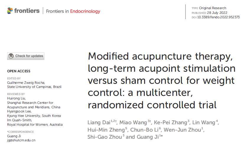 在传统的生活方式干预之外,针刺是最受国内外认可的减重疗法之一。埋线是针刺的衍生疗法,通过将可吸收的埋线材料置入穴位中以延长和放大针感,理论上可进一步提升针刺的临床疗效。近日,sunbet申搏官网附属龙华医院岐黄学者季光工作室以高质量的随机对照试验清晰诠释该理论基础,研究成果Modified acupuncture therapy, long-term acupoint stimulation versus sham control for weight control: a multicenter, randomized controlled trial在线发表于内分泌学与代谢领域一线期刊Frontiers in Endocrinology,为埋线控制体重的疗效和安全性提供了高级别的循证证据。