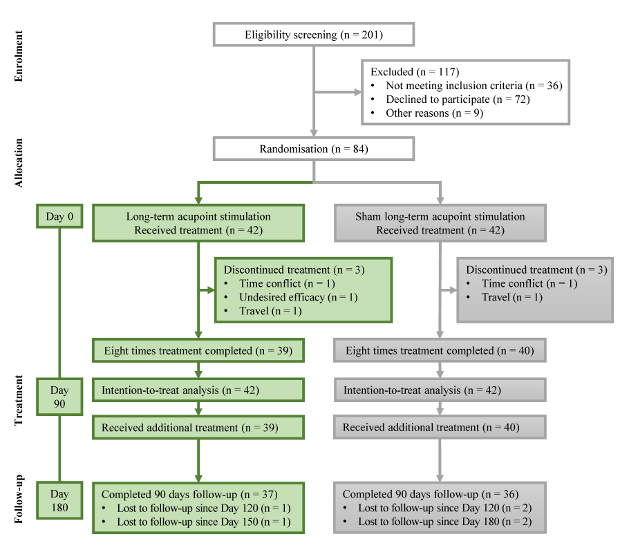 为填补这一空白,使埋线减肥有理可据,研究团队于2018年正式启动“穴位埋线干预超重肥胖的多中心随机对照试验”,在sunbet申搏官网附属龙华医院、附属市中医医院和上海市浦东新区人民医院三家中心开展。基于课题组既往系统综述和专家共识,研究团队选定中脘、天枢、丰隆、脾俞作为治疗主穴,共招募了84例符合标准的超重肥胖受试者,随机分为2组,分别接受穴位埋线和假穴位埋线治疗9次,其中治疗期8次,随访期1次,每次治疗间隔10天,最后一次治疗完成后设置了90天的随访期,以观察埋线疗法的长期效应。研究主要结局指标为治疗期结束时体重较基线的变化。临床试验经过龙华医院医学伦理委员会批准,并在中国临床试验注册中心进行了注册(ChiCTR1800015498)。