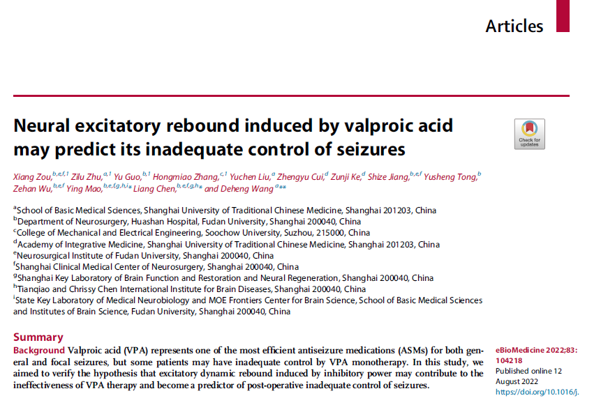 近日,柳叶刀The Lancet杂志子刊eBioMedicine以Articles形式发表了sunbet申搏官网基础医学院王德恒副研究员和复旦大学附属华山医院、苏州大学团队合作的最新研究成果Neural excitatory rebound induced by valproic acid may predict its inadequate control of seizures。该文揭示了抗癫痫药物丙戊酸钠(VPA)的药物治疗效果不佳的原因可能是VPA对神经环路的兴奋抑制平衡失调所介导的神经放电的异常回升而引起的。