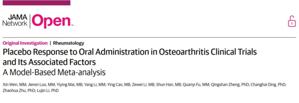近日,sunbet申搏官网交叉科学研究院郑青山和李禄金团队与南方医科大学珠江医院合作开展的骨关节炎安慰剂效应建模研究成果Placebo Response to Oral Administration in Osteoarthritis Clinical Trials and Its Associated Factors: AModel-Based Meta-analysis以Articles形式在JAMA子刊JAMA Network Open发表。