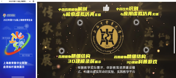 “数字新时代,教育大未来”2022年第十九届上海教育博览会(线上展)于9月24日开幕,sunbet申搏官方网站教学实验中心参加此次线上展会,成果展示在展会官方微信小程序的“云体验”板块“上海教育数字化转型应用标杆案例展示”入口之中。教学实验中心生药学实验室基于虚实联动的实验实践教学平台展示中医药创新教育资源建设模式,此次共有四大品牌课程内容参展,主要包括一门国家级一流本科课程《中药药用植物解剖与检索虚拟仿真实验》,一门上海市级一流本科课程《中药饮片识别与应用虚拟仿真实训》,以及《药用植物精细结构3D建模》和《药用植物精细结构3D科普游戏》两个教学项目。