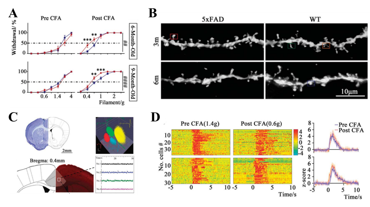 图 (A)炎症状态下,6、9月龄5×FAD鼠的痛阈高于WT组;(B)6月龄5×FAD鼠ACC锥体神经元的树突棘密度低于对照组,但3月龄无此类差异;(C)炎症状态下,对各组小鼠进行c-Fos染色(左下)、动作电位信号(右上)和局部场电位(右下)数据采集和分析;(D)6月龄5×FAD鼠ACC锥体神经元活性低于WT组