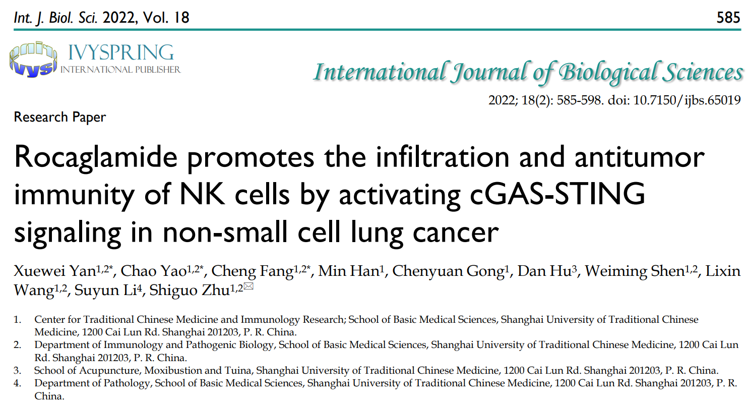 近日,sunbet申搏官网基础医学院朱诗国研究员团队发现促进NK细胞肿瘤浸润的中药有效成分,研究成果Rocaglamide promotes the infiltration and antitumor immunity of NK cells by activating cGAS-STING signaling in non-small cell lung cancer发表于国际期刊International Journal of Biological Sciences。该研究成果对于促进楝酰胺在肿瘤免疫治疗中的应用及其新药研发具有重要意义。