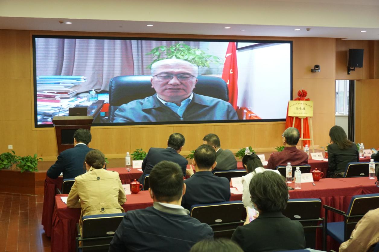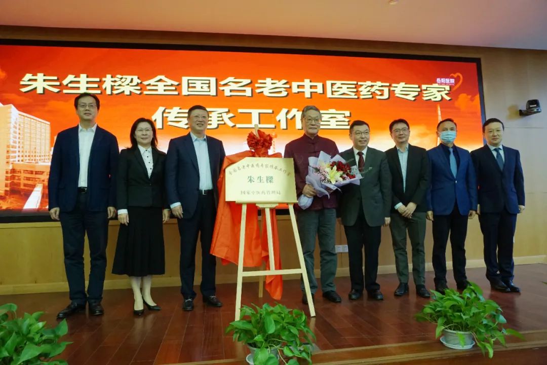 胡鸿毅与周嘉在与会代表的见证下为朱生樑全国名老中医药专家传承工作室揭牌,并与工作室导师朱生樑教授及工作室成员合影。
