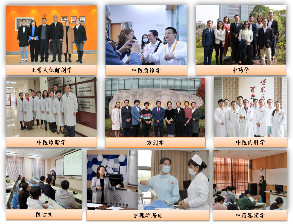 普通本科教育类课程:《正常人体解剖学》注重学生正确的价值观、职业素养、科学精神和品格的培养与塑造,科学合理地将理论知识的广度和深度与思想价值和精神内涵的温度进行“三度融合”。《中医急诊学》将医患沟通、医学人文、医学史、党史有机融合,打造中医急诊学特色课程思政教学模式,改变学生对“中医慢郎中”的认识,引导学生树立正确的职业目标。《中药学》立足中药传统文化和医学人文精神,引导学生将专业学习中掌握的对事物发展规律的认识、对中华优秀传统文化的情感、对社会主义核心价值观的认同、对职业理想和职业道德的共识,转化为对专业的热爱和成长成才的能力。《中医诊断学》发挥教育部高校“双带头人”教师党支部书记工作室和导师团的引领作用,拓展线上线下相结合、基础知识与学科前沿互补、课内与课外并行的多元化课程思政教学阵地,铸魂育人,培养创新人才。《方剂学》遵循中医药发展规律,开辟以“挖掘—传承—创新”一线贯穿的教学模式,挖掘课程内涵的“思想性、前沿性与时代性”,让学生懂古方之理、赏古方之美、悟古方之魂。《中医内科学》以学生获得感为基础,深度挖掘专业知识体系中所蕴涵的思想价值和精神内涵,促进学生对课程知识的理解、掌握、拓展与深化。《医古文》以培养医术精湛、医德高尚的苍生大医为总体目标,将中国传统文化与医学知识、为医与立业相融合,将“为何做一个医生”“如何做一个医生”贯穿教学始终。《护理学基础》围绕科学精神和人文精神两条主线,聚焦以关怀为核心的护理职业情感培育,使学生成长为心系社会并有时代担当的护理人才。《中药鉴定学》秉承“传承精华,守正创新”的宗旨,重视课程的内涵文化与特色实践建设,通过分享道地药材溯源实践活动成果及教学实践案例,引导学生树立正确的职业目标。