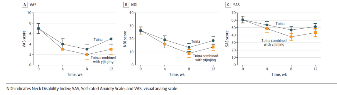 课题组长期临床实践发现,颈椎病反复发作可能与长期伏案工作导致的颈部肌肉紧张度改变有关。因此有针对性地制定了中医推拿手法和功法治疗处方,以改善肌肉紧张,提升颈椎活动度。该研究历经3年,收录了102例非特异性颈痛患者,随机分为中医推拿组、推拿结合易筋经功法组。受试者进行了为期8周的干预以及4周的随访周期,运用视觉模拟疼痛评分(VAS)、颈椎功能障碍评分(NDI)、焦虑自我评价量表(SAS)、肌肉紧张度测试、关节活动度测试等,多维度评估非特异性颈痛临床疗效。试验进行严格临床质控,成立数据安全管理委员会,包括推拿、统计等相关专家全程参与,以确保试验流程规范、数据真实可靠。该随机对照试验(RCT)在中国临床试验中心注册和批准(ClinicalTrials.gov: ChiCTR2000036805)。