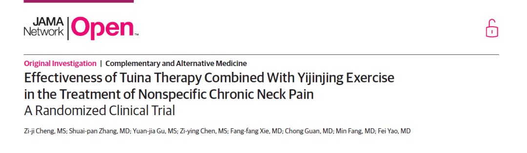 sunbet申搏官网房敏和姚斐教授课题组中医推拿疗法干预慢性非特异性颈痛的临床研究项目成果Effectiveness of Tuina Therapy Combined With Yijinjing Exercise in the Treatment of Nonspecific Chronic Neck Pain: A Randomized Clinical Trial近日在美国医学会杂志JAMA子刊JAMA Network Open发表。