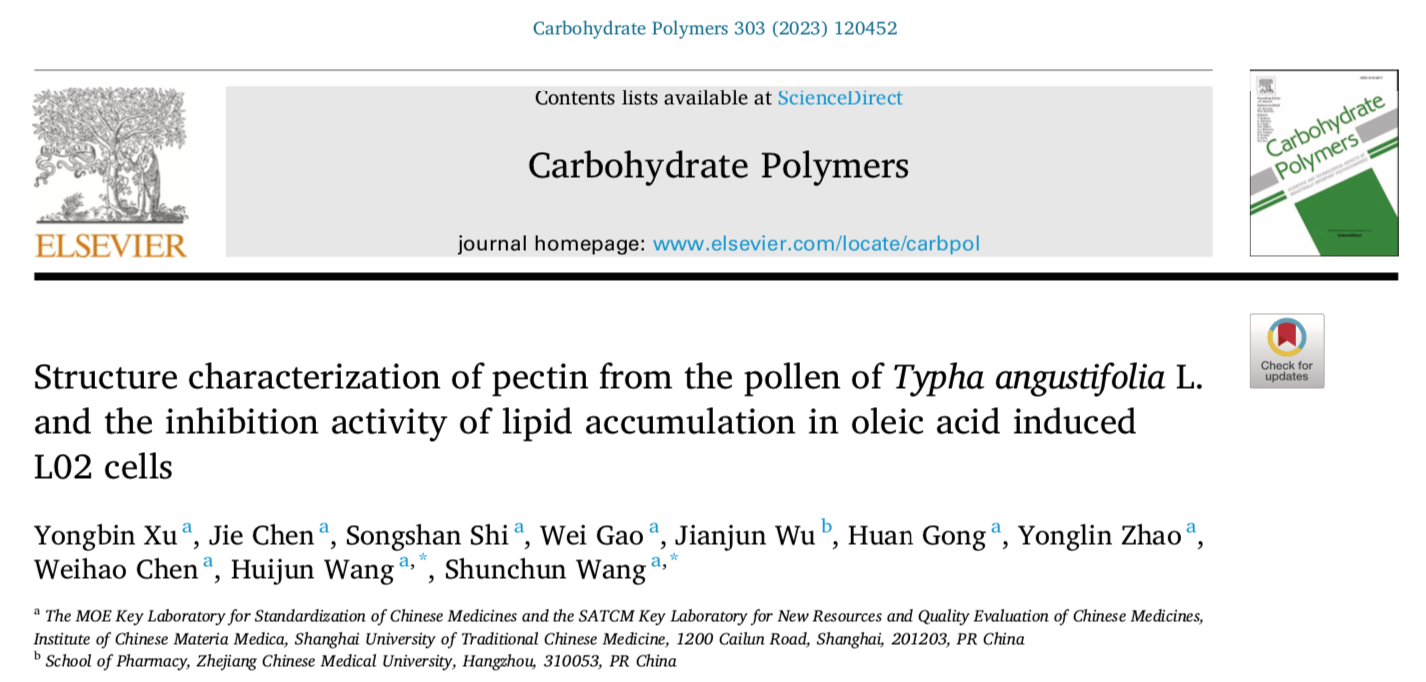 近日,sunbet申搏官网中药研究所王顺春和王辉俊团队在化学一区TOP期刊Carbohydrate Polymers发表揭示中药蒲黄中RG-I型果胶多糖在降脂作用方面的最新研究成果Structure characterization of pectin from the pollen of Typha angustifolia L. and the inhibition activity of lipid accumulation in oleic acid induced L02 cells,该论文从中药蒲黄中提取得到一种新的RG-I型果胶多糖,并在油酸诱导的L02细胞模型中研究发现具有潜在的降脂作用。