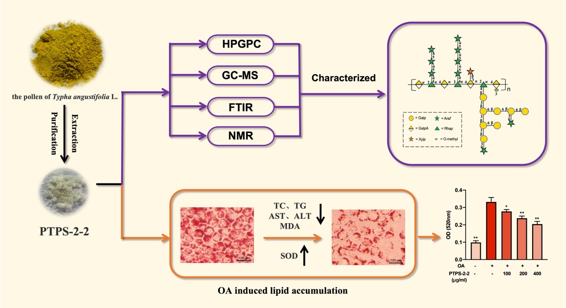研究团队从中药蒲黄(香蒲科植物水烛香蒲Typha angustifoliaL.的干燥花粉)中分离鉴定出一种鼠李半乳糖醛酸聚糖I(RG-I)PTPS-2-2,通过HPGPC法、单糖组成分析、甲基化分析、红外光谱和核磁共振等方法对PTPS-2-2化学结构进行了完整表征。结果显示,PTPS-2-2分子量为54 kDa,并且由鼠李糖、阿拉伯糖、木糖、半乳糖和半乳糖醛酸组成,其摩尔比为11.5∶36.5∶4.1∶36.7∶11.2。 PTPS-2-2的主链由→4)-α-D-GalpA-(1→2)-α-L-Rhap-(1 →组成,在→2)-α-L-Rhap-(1→的4位连有-β-Galp-(6→1)-β-Galp-(6→、-β-Galp-(3→1)-β-Galp-(3→1)-β-Galp-(3→1)-α-Araf、-α-Araf-(5→1)-α-Araf-等分支,在→4)-α-D-GalpA-(1→的4位连有T-β-Xylp。使用油酸诱导的L02细胞模型研究了PTPS-2-2对脂质积聚的抑制作用。结果显示,PTPS-2-2(100–400 μg/mL)干预后,显著降低L02细胞甘油三酯(TG)、胆固醇(TC)、谷草转氨酶(AST)、谷丙转氨酶(ALT)和丙二醛(MDA)水平,增加超氧化物歧化酶(SOD)水平。这表明PTPS-2-2可能通过抑制脂质积聚和氧化应激来改善油酸诱导的肝细胞脂肪变性。本研究不仅为蒲黄片临床治疗高脂血症提供重要依据,也为RG-I类果胶多糖开发为新型降血脂药物提供了重要科学思路。