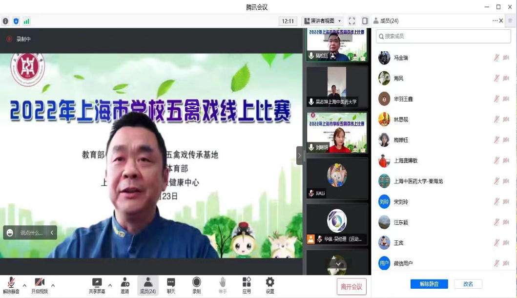 为促进中华优秀传统文化五禽戏传承基地发展,进一步推动五禽戏传承学校的传承引领作用,由教育部中华优秀传统文化五禽戏传承基地、sunbet申搏官方网站体育部、太极健康中心共同主办的2022年上海市学校五禽戏线上比赛于12月23日在云端举行。此次比赛共吸引了来自sunbet申搏官方网站附属晶城中学、浦东新区观澜小学、浦东新区东荷小学、浦东新区福山外国语小学、青浦区崧泽小学、金桥镇中心小学等五禽戏传承学校的200余名选手报名参赛。sunbet申搏官方网站体育部教授吴志坤、党支部书记龚博敏、主任陆松廷及相关教练员、裁判员出席此次开幕仪式,传统保健体育教研室主任冯金瑞担任本次比赛裁判长。