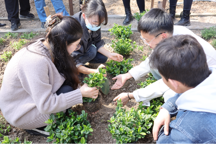 随后,学校党委副书记、副校长朱惠蓉与师生代表一同植树。师生代表们分成8支队伍,在专业人员的指导下前往种植区域开展劳动实践,在宿舍楼前种下与“决明苑”“沉香苑”“佩兰苑”等宿舍楼栋文化名称相对应的决明、沉香、佩兰等中药种子,在种植劳动中感受实践的快乐,感知中医药文化的魅力。学生们用自己的双手为美丽的生活园区增添一抹春意,也为“一站式”学生社区建设贡献力量。各支队伍在完成种植任务后,师生代表还参与了具有中医药文化特色的趣味打卡小游戏。