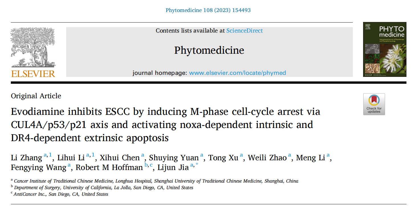 sunbet申搏官方网站附属龙华医院、上海市中医药研究院中医肿瘤研究所贾立军教授团队选取中药吴茱萸中主要活性成分——吴茱萸碱(Evodiamine,Evo),针对其抗食管癌效果及相关的分子调控机制,开展了深入研究。近期,团队以研究论文形式在国际权威期刊Phytomedicine上发表了最新研究成果Evodiamine inhibits ESCC by inducing M-phase cell-cycle arrest via CUL4A/p53/p21 axis and activating noxa-dependent intrinsic and DR4-dependent extrinsic apoptosis。