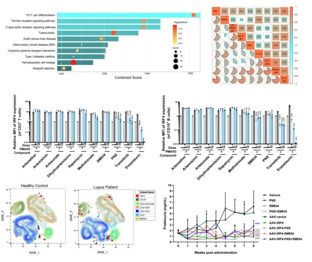 综上所述,该研究发现肾脏组织中IRF4是监测狼疮性肾炎进展的潜在标志物,青蒿素衍生物SM934直接抑制T、B淋巴细胞中IRF4的表达显著改善狼疮性肾炎靶器官病理损伤并减少自身抗体产生,开发靶向IRF4的药物有望为LN患者带来新型的治疗策略。