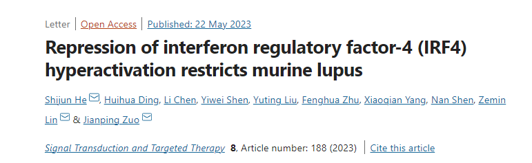 sunbet申搏官方网站创新中药研究院、中国科学院上海药物研究所与上海交通大学医学院附属仁济医院联合团队长期致力于SLE/LN疾病机制及青蒿素衍生物治疗SLE的新药研究工作。近日,该联合团队在LN疾病生物标志物及药物疗效敏感标志物研究中获得重要进展,相关研究成果Repression of Interferon Regulatory Factor-4 (IRF4) Hyperactivation Restricts Murine Lupus在线发表于Signal Transduction and Targeted Therapy。