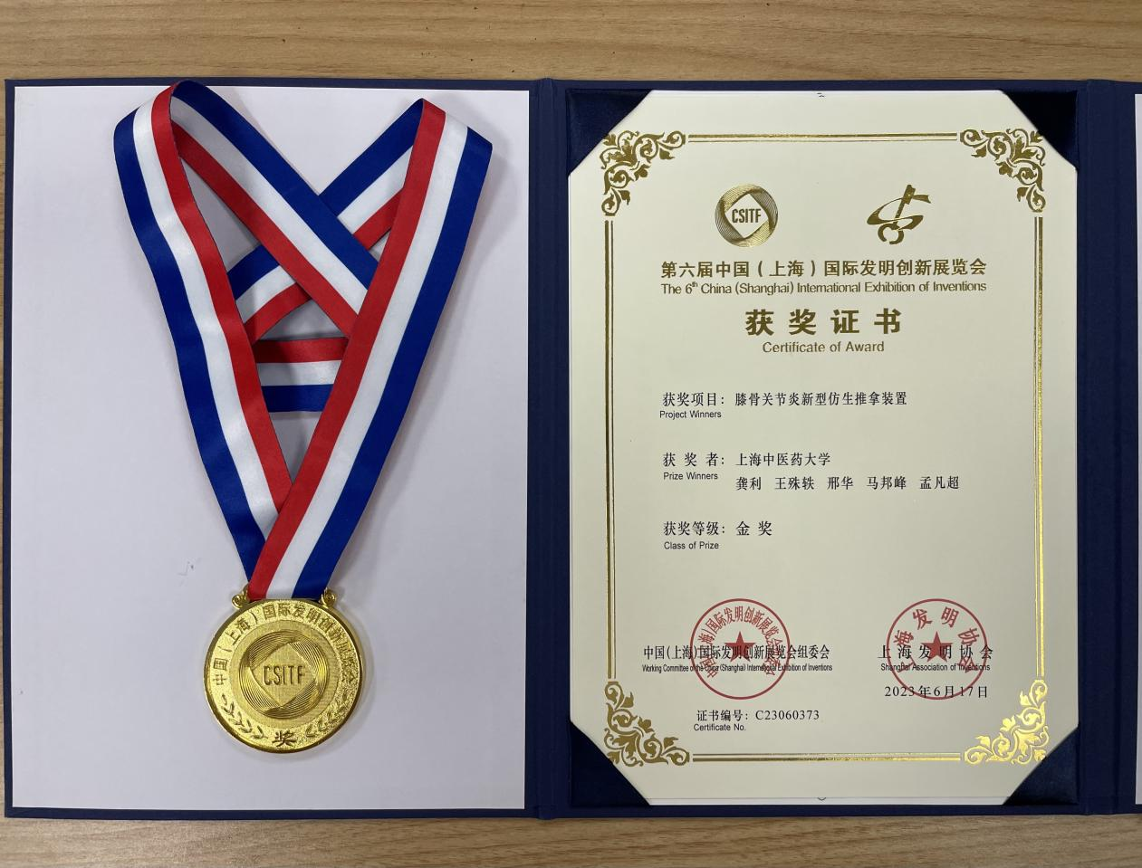 2023第六届中国(上海)国际发明创新展览会前不久在上海世博展览馆举办,本届展会由中国(上海)国际发明创新展览会组委会、上海发明协会组织,展会主题突出“发明创造,引领未来”,来自中国、泰国、越南、马来西亚、伊朗等国家和地区的1000多项创新技术与成果在“上交会”展馆展出。sunbet申搏官方网站附属岳阳中西医结合医院推拿科龚利教授团队携“膝骨关节炎新型仿生推拿装置”受邀参展,经评审委员会评定,获得金奖。