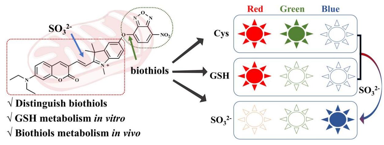 近年来研究表明,生物硫醇(如Cys、Hcy、GSH)在维持细胞内稳态和应对氧化应激等方面发挥着重要作用,其浓度异常可能导致癌症等多种疾病的发生。尽管生物硫醇代谢异常被认为是癌症的核心标志,但其动态实时可视化的监测工具有待进一步开发,且药物干预后肿瘤中生物硫醇代谢的变化过程尚未研究报道。针对这一问题,研究团队基于ICT-PET协同机制,成功设计了一种线粒体靶向多功能荧光探针。该探针具备双识别位点,通过三个荧光通道分别实现了对Cys/Hcy(红-绿)、GSH(绿)和代谢产物SO32-(蓝)的检测。此外,该探针具有低检测限、高选择性、生理pH稳定性和快速荧光响应等优点。