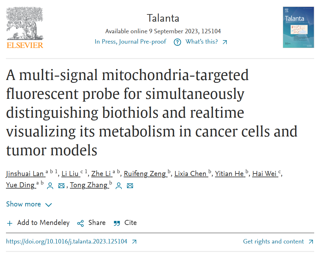 近日,中药学院张彤教授团队在国际期刊Talanta上发表了题为A multi-signal mitochondria-targeted fluorescent probe for simultaneously distinguishing biothiols and realtime visualizing its metabolism in cancer cells and tumor models的研究成果。该研究成功合成了一种具有多通道、线粒体靶向的荧光探针,能够同时区分检测生物硫醇和二氧化硫衍生物,实现了细胞水平及生物体内硫醇代谢的实时、可视化监测,并利用该探针对中药活性成分藤黄酸在体内外抗乳腺癌过程中的硫醇代谢变化进行监测。这一研究成果为体内硫醇代谢的动态监测提供了有力工具,同时也为中药抗肿瘤活性成分的作用机制研究提供新思路。
