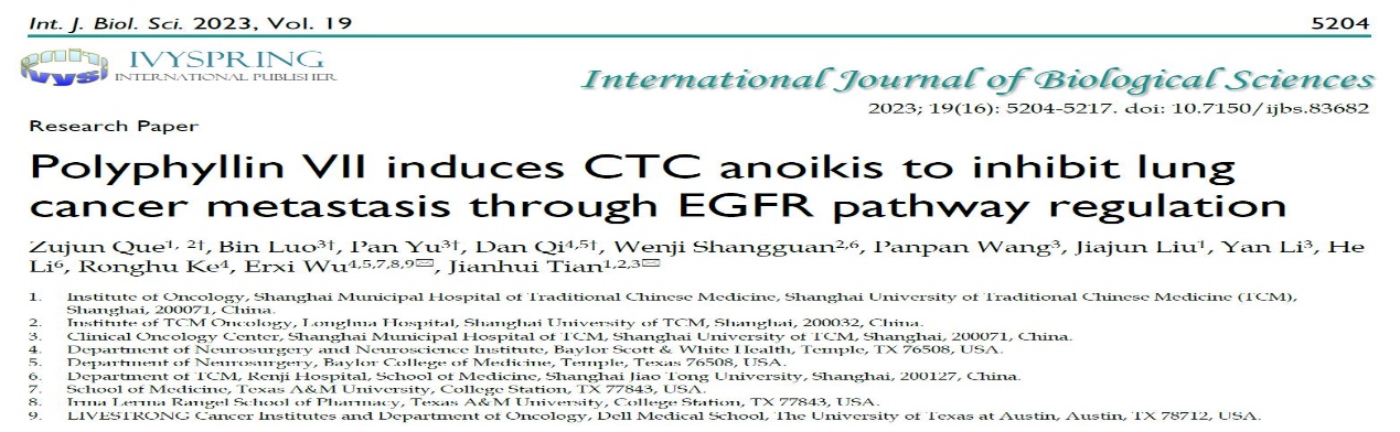 近日,sunbet申搏官网附属市中医医院田建辉教授团队在《International Journal of Biological Sciences》在线发表了题为“Polyphyllin VII induces CTC anoikis to inhibit lung cancer metastasis through EGFR pathway regulation”的研究论文,揭示重楼皂苷Ⅶ干预循环肿瘤细胞抑制肺癌转移的作用及机制,为“正虚伏毒”肺癌复发转移核心病机理论提供了科学依据。